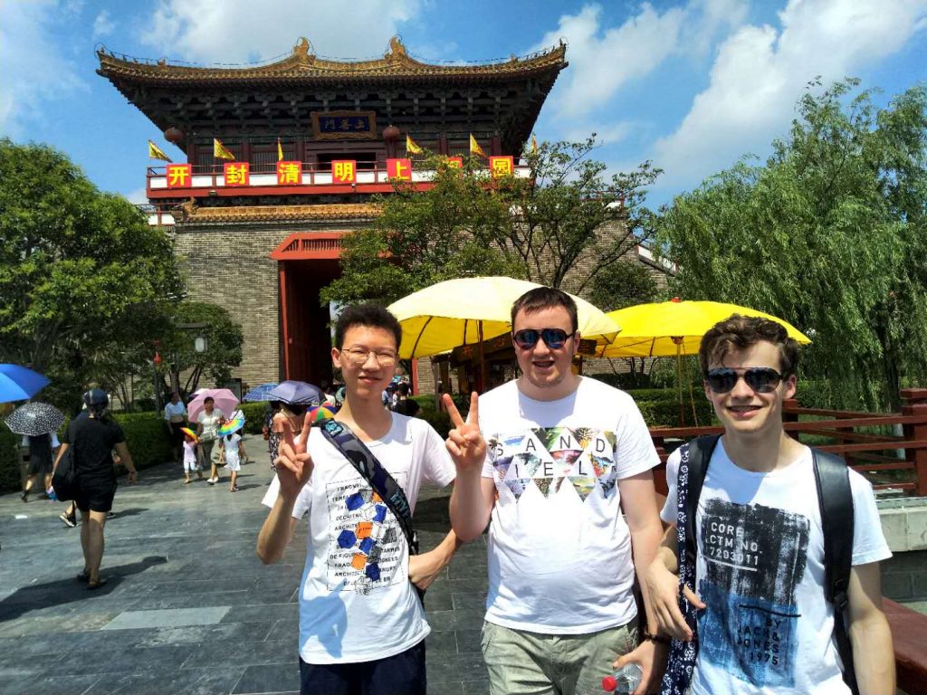 第二天,还是我们四人,一起去开封游览了大名鼎鼎的清明上河园。园内的古都风貌和汴京的美景使我们眼前一亮,并心向神往。 昆腾是如此的兴奋,跑来跑去,看个不停,问个不休,急于了解我们的古代文化,我也尽其所能向他讲解或翻译各种园景、时代背景和他眼中的新鲜事物: 有建筑中的斗拱结构、有宋服中的对襟直裰和东坡巾,有古代油纸伞和特色小吃,有歌舞戏剧和民间杂耍,还有大宋保卫战炮火轰鸣的精彩表演。 虽然有时候特色词汇不能确定,不过借助手机词典,和他沟通还是比较顺利的。
