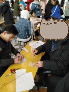 还是老样子,我们让贺奎源和田益多去讲解,我、李荣桓和范毅森做模型。今年让做一个高塔,要求能承重5块铁板。我们开始动手。材料和第一次一样:几根木条、502胶水、剪刀、签字笔和尺子。我们在搭建骨架的时候想到一个好点子:用剪刀袋子的窟窿固定三根基柱。不久,三角形底架也固定好了,我们开始搭建上层。在经历了1个多小时的努力后,框架搭好了。开始做加固工作。加固也就是把中间的部分顶点用木条连接,构成2个三角形。不久,加固工作做好了,差不多也就2个多小时,快到完成时间了。我们看看手机聊聊天来等待。时间到了以后,我们把作品放在指定位置,去吃饭了。因为李荣桓要给手机贴膜,贺奎源和田益多有其他事(←_←),所以我和老范一起吃,吃的砂锅。吃饭前,我去买了一张刮刮乐,5元的还是10元的我忘了。最后中了相同的金额。哈哈哈,运气也不赖!!!