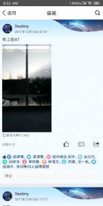 2017年12月16日,我参加了第一次科技创新大赛,老师是杨习海。当时队员是田益多、周泱帆、李昊洋、杨海峣和我。我是队长。这张图片是早上登上校车出发时拍的,而且我发了一条说说。当时发现同行的还有9071的原高二队员们。他们也是要去参加某些比赛。