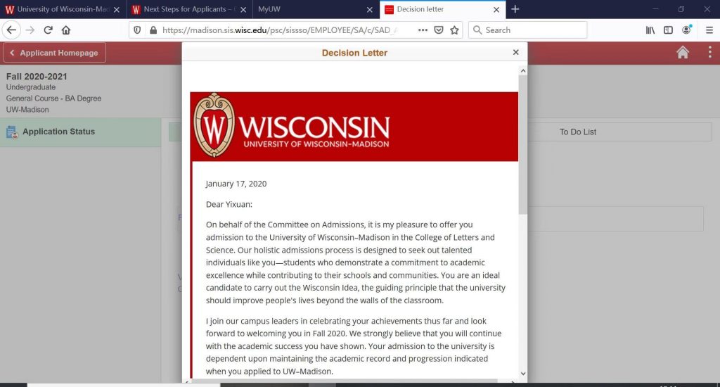 随着一声Outlook邮件的提醒声,我原本放松的神经突然变得紧张起来。这个邮箱是申请季专用,这意味着这封邮件要么是Offer,不然就是拒信。我小心翼翼地打开这封邮件,威斯康星大学把我录取了!