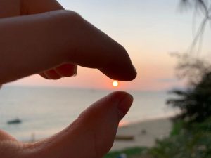 在我们住宿旁边就是著名的景点天涯海角,我们一大早上就来这里了。海风带着早晨的清爽与安宁如细润的手轻抚着我的全身。太阳似乎还在昏睡,好似醒来后要把大地灼成炼狱一般。想上瞭望,蔚蓝的天空漂浮着为数不多的云彩;微微低头,进入视线的是一棵棵热带特有的椰子树,宽大的叶片在风中摇曳。